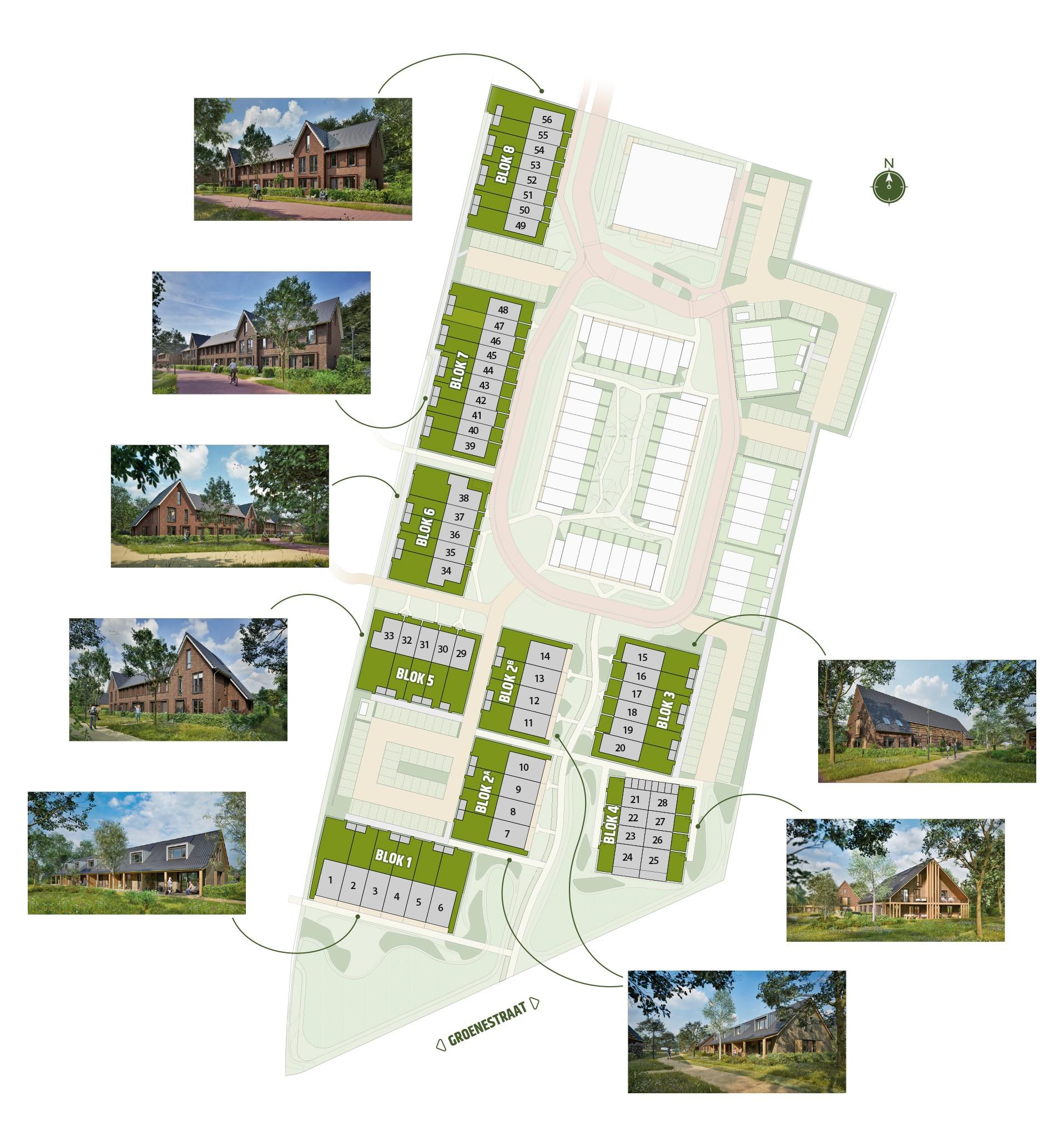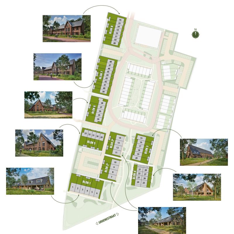 Ten slotte hebben we nog een markant gebouw aan de Groenestraat, weergegeven op de naastgelegen sfeerimpressie. Een royaal overstek met veranda en balkon in één is de kers op de taart. Hier kan je maximaal in verbinding met het landschap wonen.